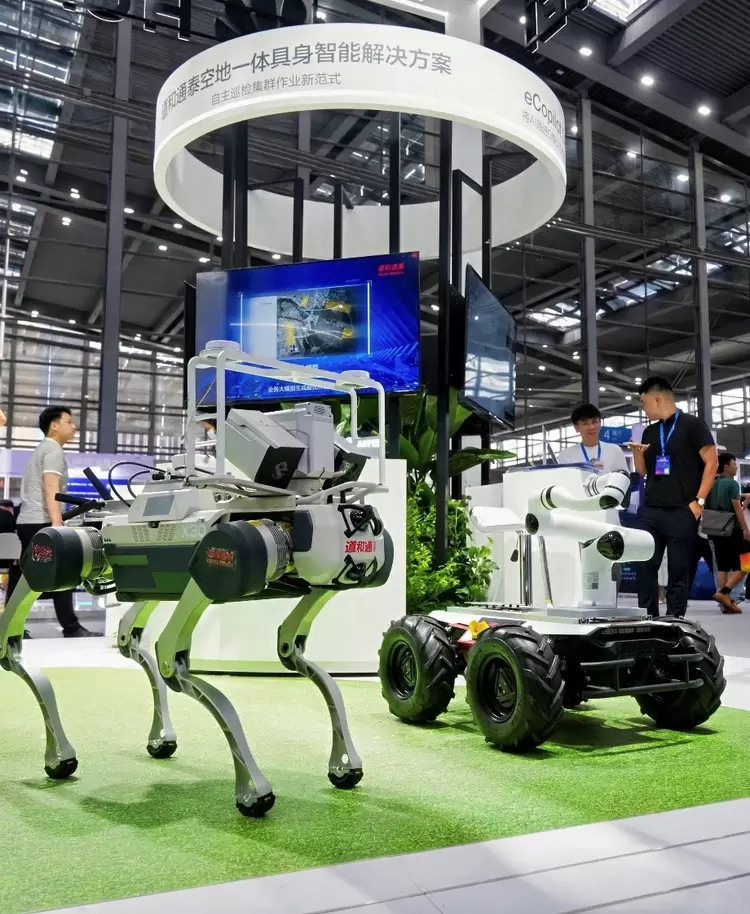 道和通泰机器人带来的空地一体具身智能解决方案吸引众多关注,该方案融合了空中智能体即无人机、地面智能体包括人形机器人、轮式机器人等,以及三大自研垂域大模型。其大模型部分基于昇腾AI云服务+DeepSeek赋能,能够实现通过自然语言交互,调度空、地智能体进行自主巡检和集群作业。