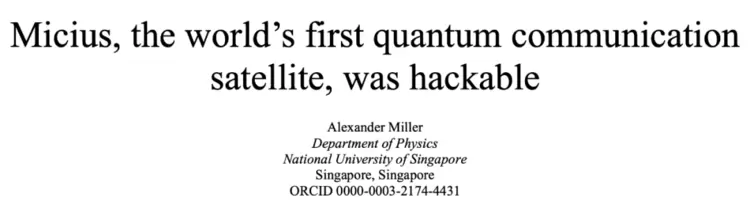 论文作者为亚历山大·米勒(Alexander Miller),来自新加坡国立大学物理系。论文标题:“Micius, the world’s first quantum communication satellite, was hackable(世界首颗量子通信卫星‘墨子号’是可攻破的)”。