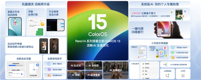系统层面OPPO Reno14系列出厂预装广受好评的ColorOS 15,功能丰富的同时流畅耐用。OPPO Reno14系列还有系统级的AI体验,包括三指上滑触发的小布记忆,日期、地址等都能记住,跨平台收藏更方便。加上各种照片后期的AI功能、AI意图搜索、满血版DeepSeek等AI能力加持,给用户全方位AI新体验。