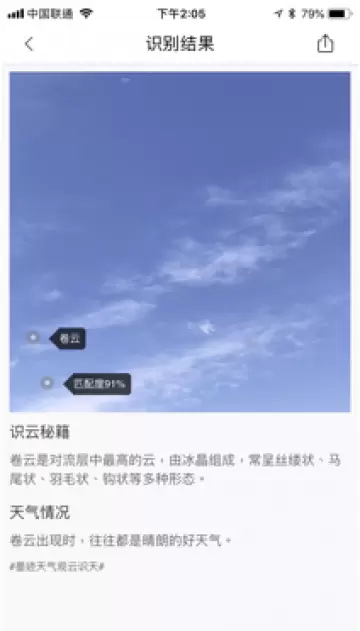 目前“观云识天”的部分AI能力已经可以在墨迹天气App中体验,只要将手机对准蓝天上的白云,便能识别出该云朵属于什么类别,并能分析出该云彩背后所蕴含的天气信息。相信当该能力与手机完全整合之后,能演变出更强的气象分析能力。