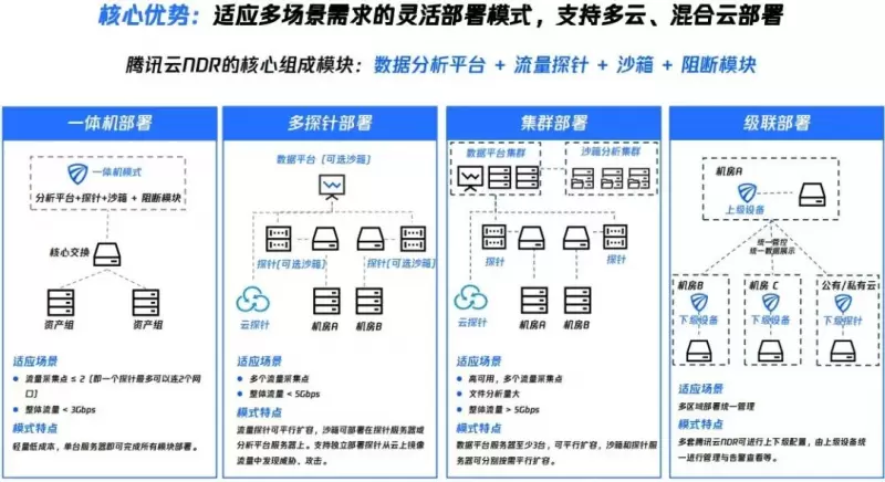 在部署方式上,腾讯云NDR兼容了不同企业IT环境的需求,能根据客户流量规模的需求,结合企业自身的IT架构进行灵活部署。腾讯云NDR一方面与腾讯云做强结合,在服务好云上客户的同时,在技术层面上更多地与云底层去结合,提供多云、混合云场景的流量安全运营体系和部署方案。