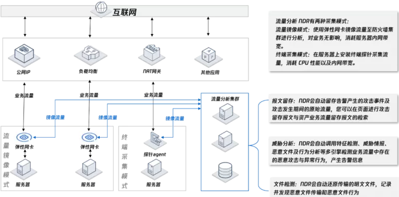 针对多云和复杂的IT环境,腾讯云NDR支持在公有云原生接入镜像流量和线下机房。提供对互联网出口流量、负载均衡、NAT网关等南北向流量,和子网内、容器间等东西向流量做检测,实时发现资产风险、入侵事件、内部渗透攻击事件等能力。同时,留存原始报文和流量日志方便事后做溯源分析。通过云沙箱和静态文件检测能力,腾讯云NDR能发现恶意文件传输,洞察恶意文件的一切行为,发现未知威胁。