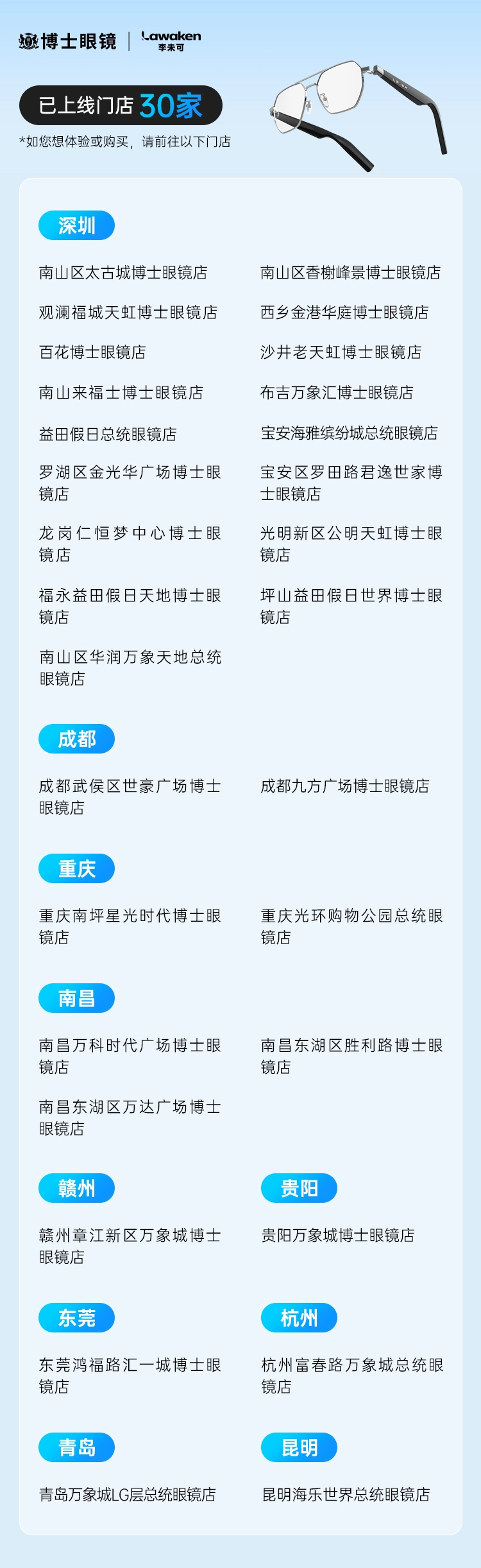 目前,LAWK City AI智能眼镜已率先登陆博士眼镜官方商城小程序及博士眼镜全国30家线下门店,覆盖深圳、成都、重庆、南昌、赣州、贵阳、东莞、杭州、青岛、昆明核心城市,让更多消费者能够近距离体验 AI 智能眼镜的科技魅力。