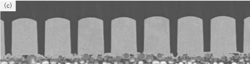 本次推出的“TA系列”正是基于这一市场需求而研发。通过采用旭化成长期积累的感光性材料技术,并结合全新的材料设计,该系列产品在RDL形成所需的4μm节距设计条件下,利用LDI曝光可实现1.0μm线宽的图案形成,是非常适用于面板级封装※4等微细配线形成的感光干膜材料(见图a、b)。所形成的微细光刻图案,经过SAP(加成法)※5电镀图案形成工艺以及后续光刻胶剥离步骤后,可在4μm节距设计条件下实现3μm线宽的电镀图案形成(见图c)。