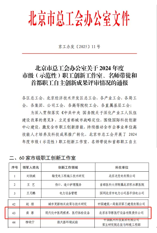近日,北京市总工会发布《关于认定2024年度市级(示范性)职工创新工作室、名师带徒和首都职工自主创新成果的决定》,北京东华原医疗设备有限责任公司的南原创新工作室荣获北京市职工创新工作室荣誉称号,成为本次入选的北京市60家职工创新工作室之一。
