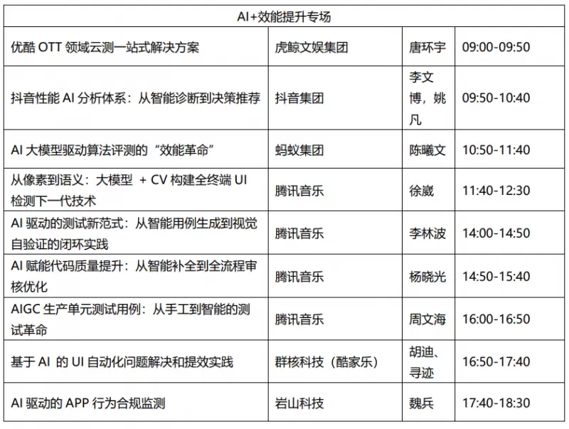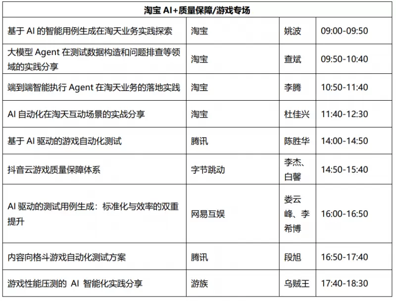 同时,各专场出品人也均为行业内资深专家,如支付宝多媒体及算法质量负责人罗军(无过)担任 AI 质量新范式专场出品人,莉莉丝游戏大数据测试与质管中台业务高嵘为游戏专场出品人,酷狗音乐研发效能中心技术总监李焕雄负责 AI + 效能提升专场,中国信通院云大所高级业务主管马龙飞出任 AI + 质量保障专场出品人,淘天集团高级测试开发专家王大鹏担任淘宝 AI + 质量专场出品人,他们将凭借自身在各自领域的深入研究与丰富实践经验,精心策划专场内容,为参会者带来极具价值的知识分享与案例剖析。