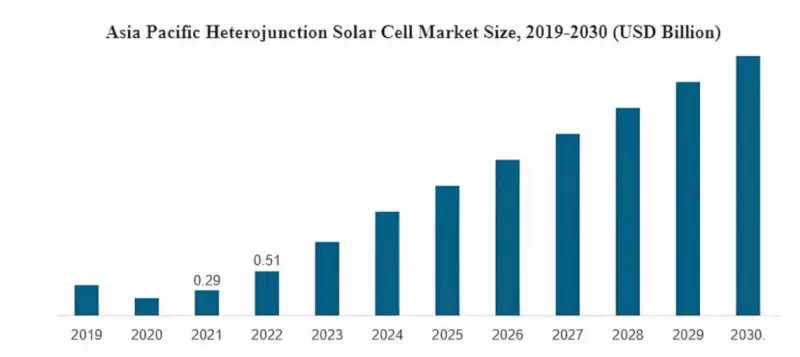 中国光伏行业协会预测,异质结太阳能电池片的市场份额将从2023年的2.6%增长到2030年的34.3%。美国Fortune Business Insights也有报告称,到2030年,全球异质结太阳能电池市场将达到66.7亿美元,呈现可持续的强劲态势。
