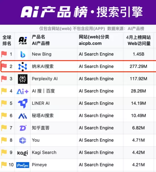 在36kr、硅星人|沃垠AI联名发布的AI产品榜(aicpb.com)4月榜单上,纳米AI目前位列AI搜索引擎中国市场第一、全球第二,高于最新估值140亿美元的海外知名AI搜索产品Perplexity。从月度访问数据上,纳米AI搜索目前断崖式领先国内其他AI搜索产品,已成为国内AI搜索龙头。