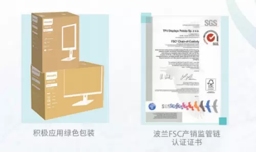以环境责任为例,目前飞利浦商用显示器所有主体塑料部件、金属外壳部件和包装材料均采用可回收利用的材料,严格遵守RoHS(欧盟环保指令)标准,不含铅、汞等毒性物质,可减少显示器对人体及环境的影响,环保属性贯穿从制造到废弃的整个产品生命周期。基于此种优势,飞利浦将ESG的建设升格至对碳足迹的追溯,向供应链采购提要求、为产品销售的环保溯源提供保证。同时,飞利浦商用显示器的外包装100%使用FSC认证环保纸质材料,实现减量化、可再生、可降解三重环保设计,进一步从源头减少环境负担。