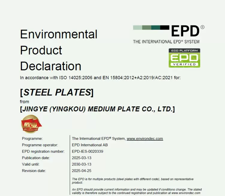 近日,敬业营口中板环境产品声明(EPD)正式通过国际权威平台EPD International发布。这是敬业集团践行国家“双碳”战略、加速绿色制造体系建设的又一重要成果。