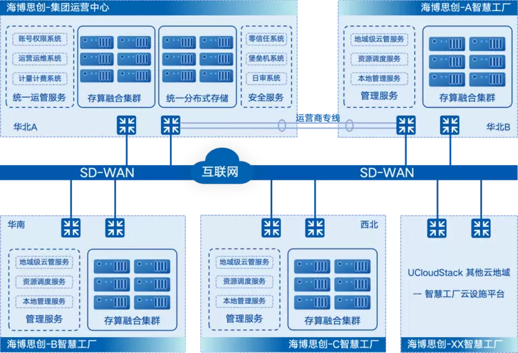 基于客户多个物理地域分布的基础设施建设需求,凭借UCloudStack成熟稳定的多地域云平台+边缘云能力,成功构建覆盖全国办公区与厂区机房的集团云架构,实现“一朵云”统一管理,显著提升运营与运维效率。