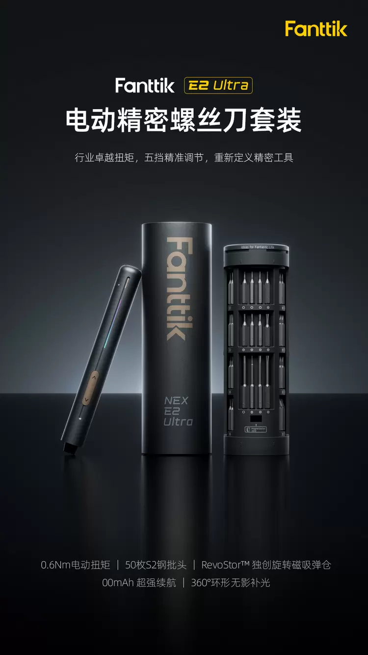 Fanttik始终秉持精益求精的态度,以创新科技驱动发展。坚持为用户提供更好的生活体验。在品牌创始人杜波“聚焦产品细节,追求独特体验”理念的引领下,Fanttik于5月20日在国内推出了E2 Ultra 电动精密螺丝刀套装。E2 Ultra拥有行业顶尖的0.6N.m最高电动扭矩和3N.m最高手动扭矩,5档扭矩精准调节不伤螺丝,在配件上,50枚S2钢批头一站式解决多场景拆装问题;在设计上,采用行业唯一的磁吸旋转弹仓收纳,工具切换效率提升60%,解决了传统工具切换效率低的痛点;创新的使用渐变LED能量条与360°环形补光兼具科技美学与实用性,前者在科技感外观下实时监控电量状态,后者则让用户在弱光环境下也能精准定位螺丝孔。