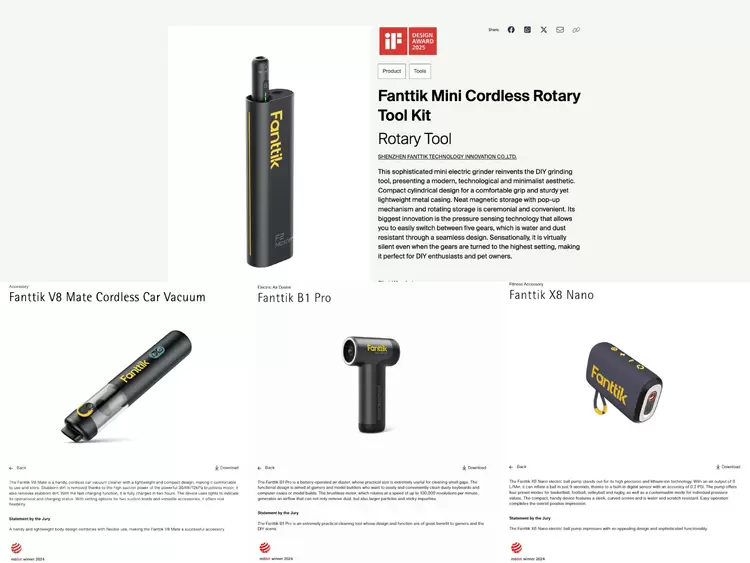 在产品维度,Fanttik从工具类产品拓展至汽车周边领域,不断突破业务边界。在五金领域,凭借无绳、锂电的多合一产品,成为2024年TikTok海外用户们关注的新兴头部品牌之一;在汽车周边领域,用心打磨细节,推出V10 MIX、 X9 APEX、V8系列等畅销产品。以X9 APEX智能充气泵为例,其采用的“无缝”一体机身设计,不仅带来舒适握持体验,更展现了对工业设计美学的极致追求;其去年在国内推出的V10 MIX吸尘器也以智能交互LED屏将产品科技感拉满,电量及运行状态一目了然……这类用心的设计也让Fanttik收获颇丰。2018年起至2024年,Fanttik13款产品斩获红点奖,13款产品斩获IF产品设计奖,2022年起,3款产品斩获美国拉斯维加斯改装车展览会产品奖项,展现其在产品研发设计领域的强大实力。2025年,Fanttik再获8项红点设计奖,其中,Fanttik-F2 Master 3.6V精密电磨斩获红点设计奖,并同步摘得iF DESIGN AWARD 2025设计大奖双料桂冠。