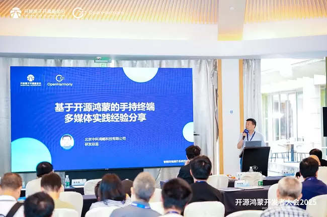 在硬件分论坛上,公司研发总监黄登成发表主题演讲《基于开源鸿蒙的手持终端多媒体实践经验分享》,围绕开源鸿蒙在手持终端上的多媒体子系统适配、音视频编解码适配的实践展开分享。中科鸿略作为开源鸿蒙生态的核心贡献者,基于开源鸿蒙5.0版本,成功打造了全国产化工业手持终端系列,深度融合多媒体技术与企业级场景需求,从芯片-硬件-系统-应用-场景落地开源鸿蒙终端解决方案。