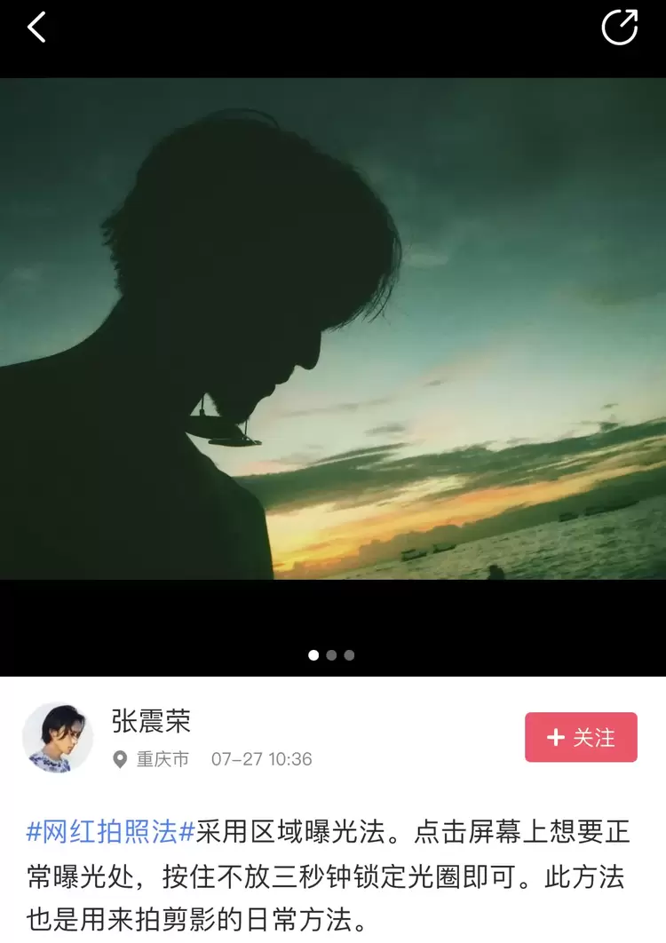 美图秀秀里的小哥哥们似乎格外青睐剪影拍摄法。来自重庆的张震荣小哥哥的拍摄秘诀是区域曝光法——点击屏幕上想要的正常曝光处,按住三秒锁定光圈即可。