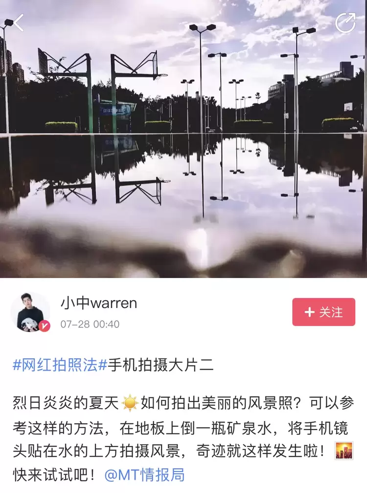 同样是拍风景,一个矿泉水瓶带来的倒影效果就显得格调满满,绝对可以让你在同场景命题拍摄的竞争中脱颖而出,制霸朋友圈!
