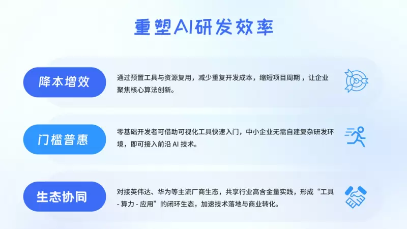加速模型开发:平台预置百款模型镜像及全流程开发工具链,助力租户AI应用上线周期从月级压缩至天级,显著提升开发效率。