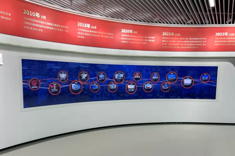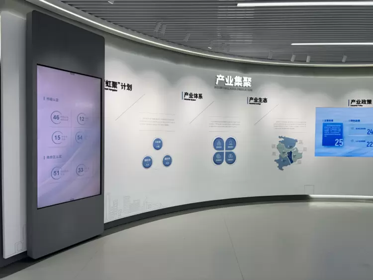 在“发展历程”、“虹桥服务LOGO展示墙”等核心展区,飞利浦1305XE系列超窄边拼接屏以0.88mm极窄拼缝打造“无缝视界”,结合定制触摸定位框,实现多屏联动与云平台数据交互。例如,86寸滑轨系统通过红外触控与轨道定位技术,实时联动画面与物理位移,使产业政策解读从单向传播进化为动态探索。这种“空间+数据”的双重交互设计,精准契合政务场景中复杂信息的可视化需求,让观众在指尖滑动间读懂虹桥的产业聚合脉络。