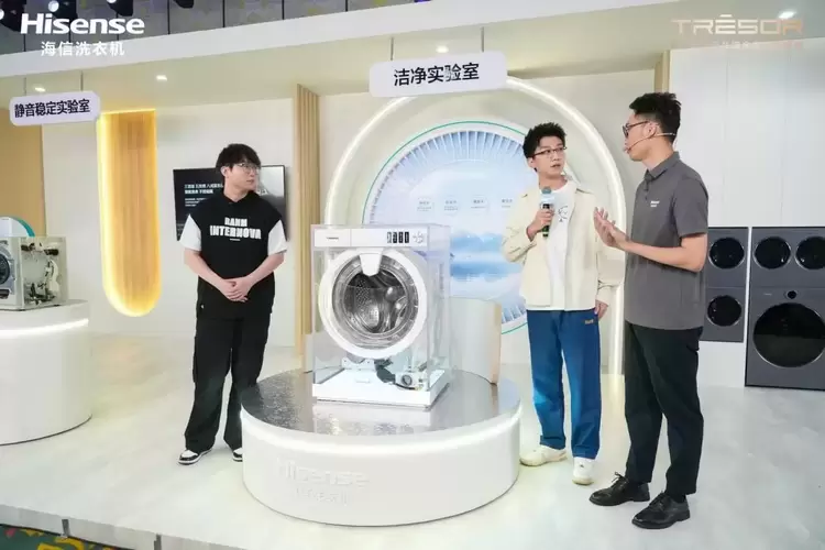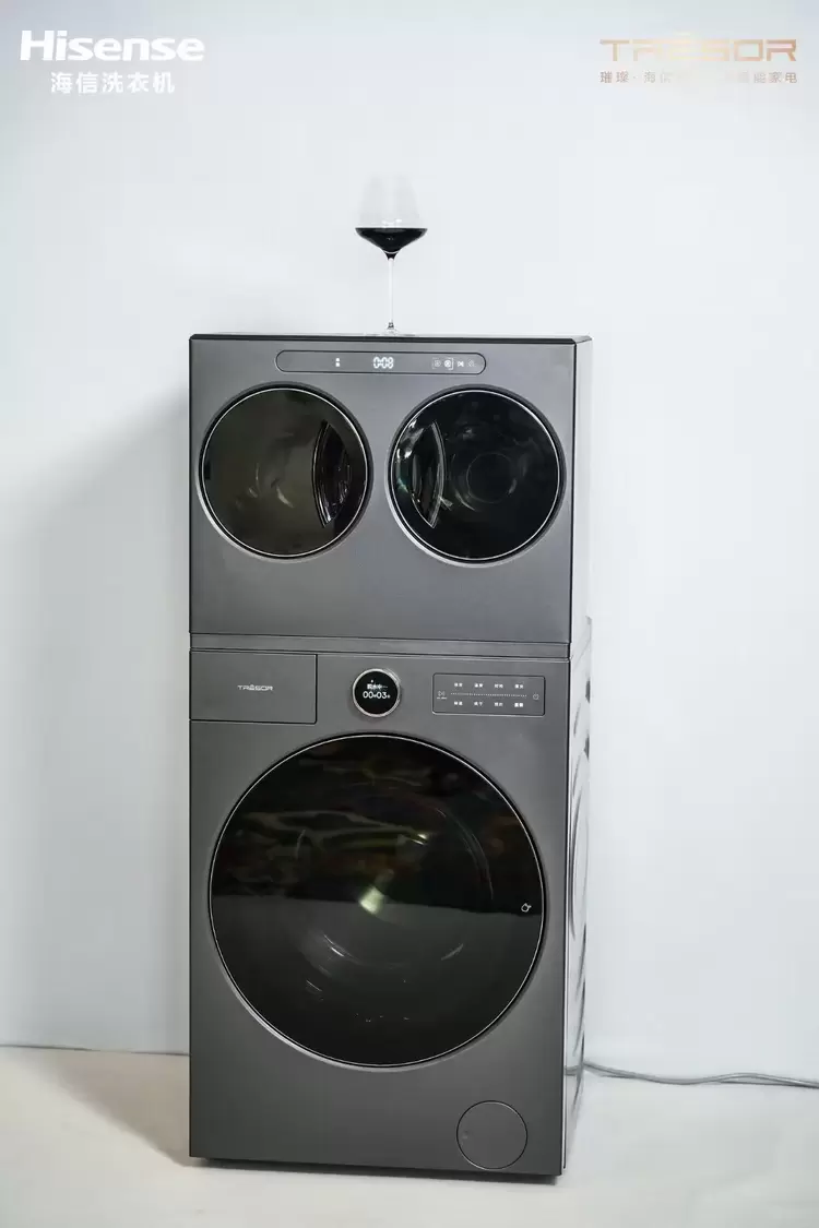 面对中国家庭普遍存在的阳台空间局限,海信创新性推出全球首款4合1热泵洗烘一体机,其搭载的“宙斯集成式热泵烘干系统”,在标准尺寸内实现了洗衣机和烘干机的集成,不仅可以实现1:1正反转匀透烘、低温柔烘、毛絮过滤、冷凝器自清洁等,达到干衣机一样的烘干效果,还大幅节约了用户的空间占用,省去了洗涤后需要将衣服搬运到干衣机进行烘干的操作,真正实现了洗烘一步到位;洗衣机噪音大是多少家庭的痛?这背后是减震系统的“硬实力”差距。纯享会现场,高速运转状态下红酒杯纹丝不动的实验,直观验证了机身超凡稳定性。海信三筒洗衣机内有3直驱电机、5组变频器、8 组减震弹簧结合内置的减震系统,全面提升机身的稳定性,有效降低运行噪音。即使三筒一起开启,运行噪音也仅有46dB,终结夜间洗衣扰民困扰;衡量洗衣机优劣势,避不开的指标永远是“洗净效果”。海信三筒洗衣机旗舰版将洗净比突破至1.33(国标基准1.03),白衬衫经十次机洗仍可保持本色,刷新行业洁净天花板。轻享版则搭载了90% 毛屑过滤的活水洗 4.0技术,可以实现边洗边除毛屑,毛屑去除率达90%以上,深层洁净更健康。