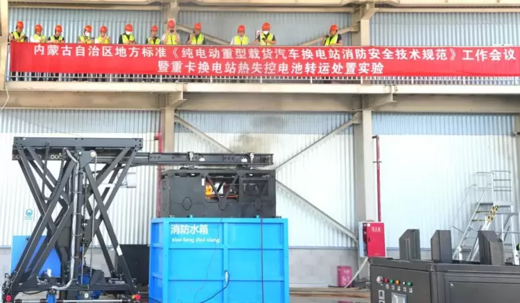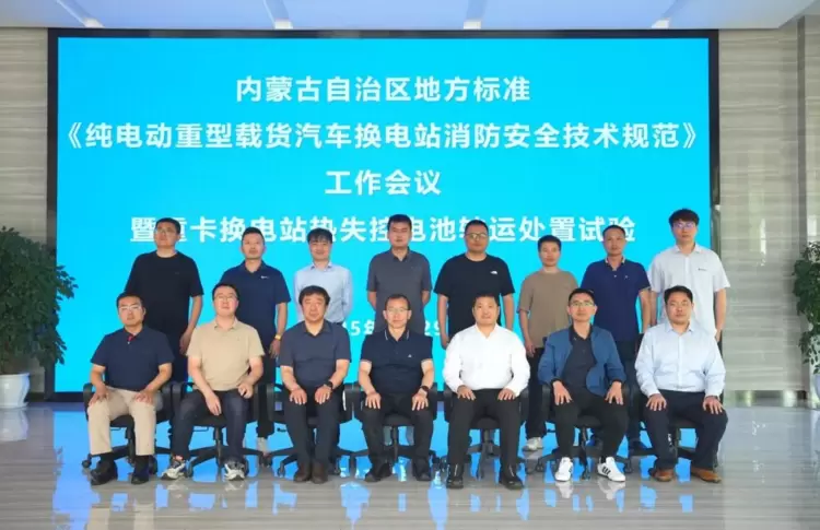 来自内蒙古自治区消防系统、宜宾消防支队、其他电力企业及能源科技领域的标准编制组共17名专家组成评审团,现场验证电池热失控的极限测试,并参与内蒙古自治区地方标准《纯电动重型载货汽车换电站消防安全技术规范》工作会议,标志着新能源电动重卡换电站热失控电池转运处置从此有据可依。