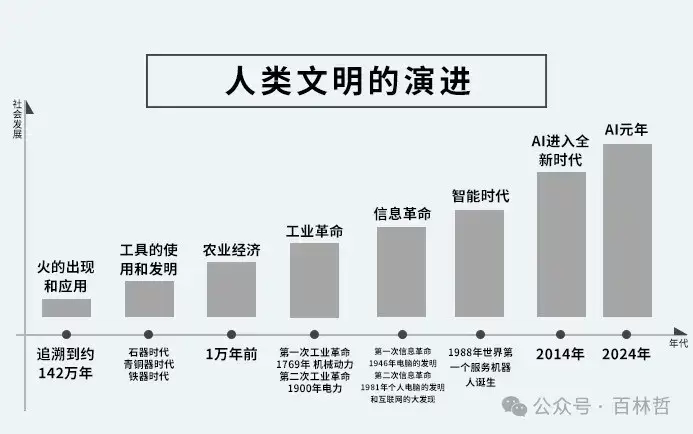 纵观历史,技术进步一直是经济发展文明演进的底层驱动力。人类文明的历史就是从火的应用开始,到经济真正开始增长,是从第一次工业革命,有了机械化的工具,直至第二次工业革命电力,再到信息时代的几代革命。