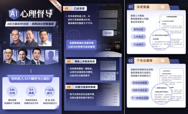 AI心理督导汇集了张海音、徐勇、张沛超、刘亮、杨发辉等多位资深业内大咖四十余年的丰富督导经验,模拟真实督导对话场景,以专业力量帮助咨询师提升咨询能力,未来还将有更多资深督导师加入。与传统耗时的案例整理方式不同,AI心理督导支持口述呈报、模板上传和AI练习室逐字稿三种便捷途径,帮助咨询师一键开启高效成长之旅。督导结束后,系统还会自动生成复盘报告,精准提炼要点、总结优劣势,并为咨询师定制个性化胜任力提升指南。