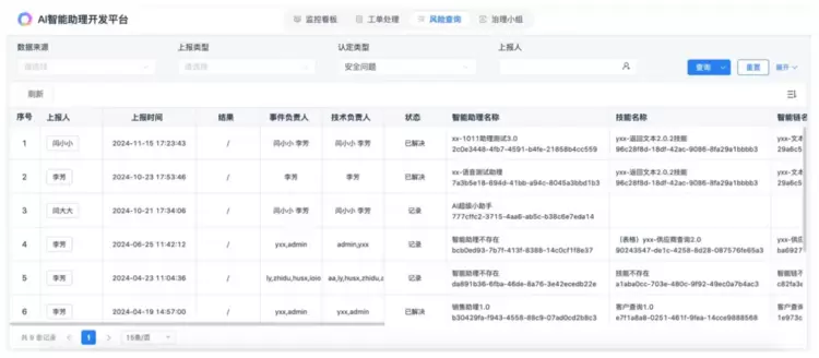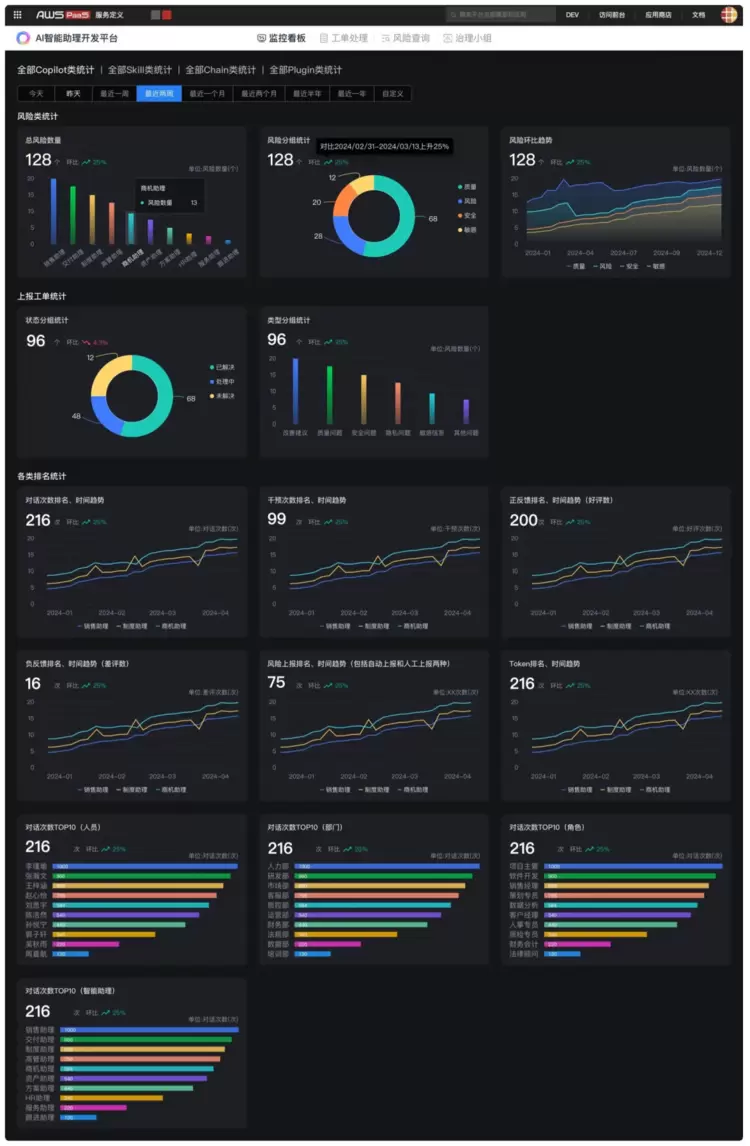 风险控制:通过审计系统,监控偏见、错误信息并提供反馈通道。风险仪表盘提供实时风险类型(如隐私、安全)和趋势洞察,治理团队确保快速识别和缓解问题。例如,仪表盘可显示一段时间内出现的风险、隐私、质量问题。