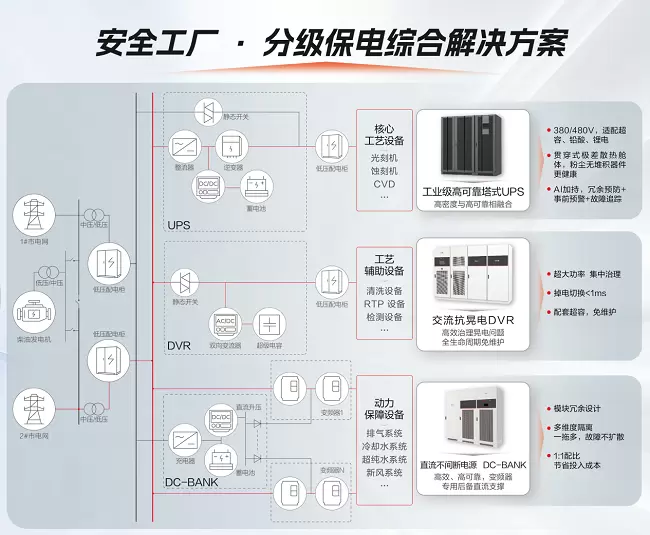智慧电能,电尽其能。半导体制造作为精密制造行业的“皇冠明珠”,对供电系统的安全性及可靠性要求近乎苛刻。科华深谙行业痛点,为客户打造省时、省钱、省心的分级保电综合解决方案,可根据不同负载特性,进行精细化管理,引导关键供电从无序走向有序,推动行业供电系统的安全性、可用性迈向新台阶。