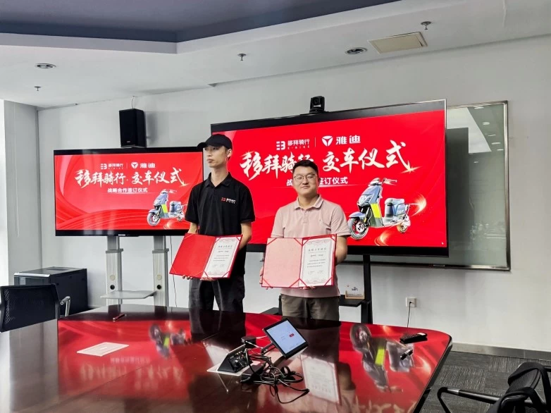 签约落地:七大领域合作深化行业生态共建在此次深度的走访交流中,移拜骑行与各企业签署了涵盖技术研发、市场拓展、服务升级等领域的战略协议,形成多项合作成果。此次合作标志着移拜骑行在产业链资源整合上的重大突破。雅迪、爱玛等企业作为行业技术引领者,其成熟的制造能力与移拜骑行的数字化运营优势形成互补。例如,移拜骑行将与雅迪、爱玛等共同探索定制化车型,优化租赁与销售业务。