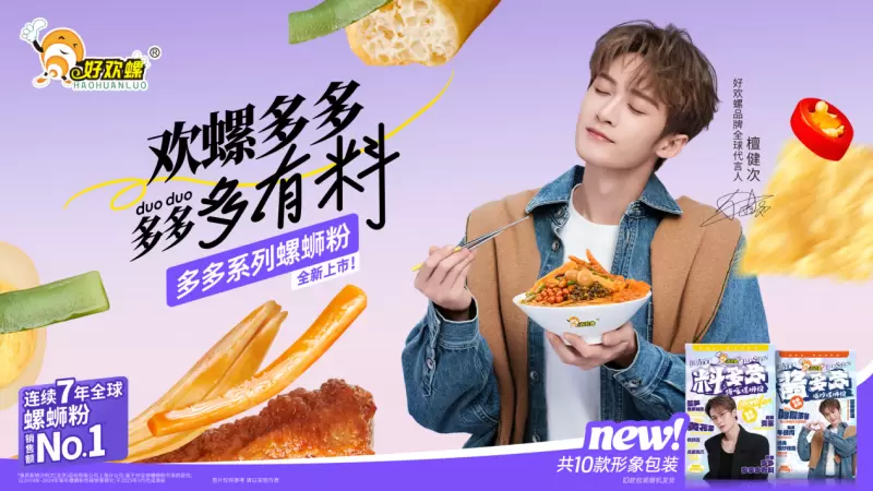 作为好欢螺品牌代言人,好欢螺以檀健次小名“多多”与新品系列深度绑定,推出欢螺多多系列,既包含了对代言人的肯定与支持,更精准体现了新品料多的特点。欢螺多多系列螺蛳粉包含两款创新产品:好欢螺料多多嗨吃螺蛳粉——11种豪华配料包颠覆传统,新增贡菜、鹌鹑蛋、虎皮凤爪、油豆腐条等网红食材,搭配秘制带渣辣油与双倍酸笋,打造“脆、嫩、弹、糯”的层次感,让每一口都充满惊喜;好欢螺酱多多爆炒螺蛳粉——以双重秘制酱料包为核心,醇香猪油与肉末螺蛳酱爆炒出地道柳州风味,搭配午餐肉、酸笋、黑皮木耳等配料,还原街头巷尾的烟火气。