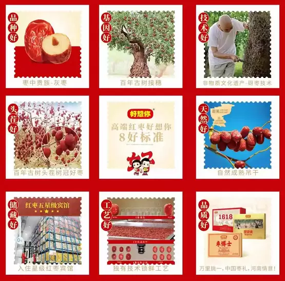 红枣专家好想你专心挖掘红枣文化内涵和中国传统文化传承。红枣专家好想你深耕“红黄文化”,以千年枣韵为根基,以黄帝文化为精神纽带,构建起品牌独有的文化坐标系。所谓“红”,是八千载枣林根系深扎华夏沃土的文明脉络,是五千年农耕智慧凝结的甜蜜传承;所谓“黄”,是中华文明始祖轩辕黄帝所象征的民族精神图腾,是同源共流的文化根脉。好想你将这两种镌刻着民族基因的文化符号深度融合,匠心推出“黄帝御枣”系列产品,严选特级原料。