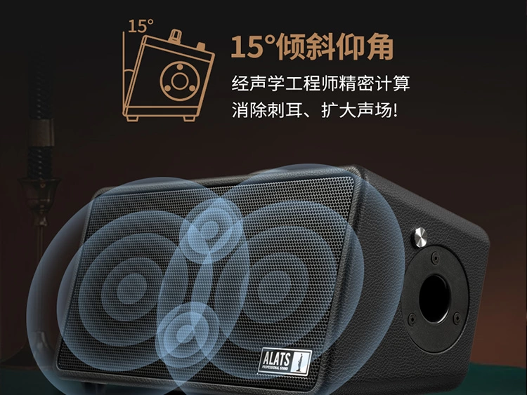 ALATS演艺者M5箱体采用木质框架手工覆皮工艺,搭配铜艺旋钮与酷黑金属面板,凸显手工匠人情怀,复古与现代对撞出灵感火花。为扩展音响落地放置时的声场,经声学工程师精密计算,ALATS M5与地面垂线形成15度夹角,有效消除刺耳、扩大声场!