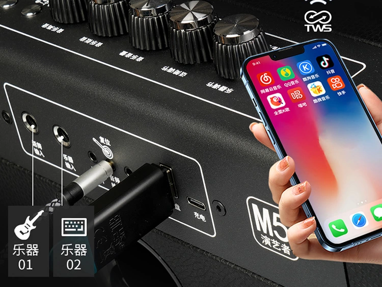 在乐器演奏功能方面,ALATS演艺者M5丝毫不输市面上动辄三四千甚至上万的同类产品!ALATS M5自带2路乐器话筒输入,支持蓝牙伴奏、U盘伴奏和AUX伴奏。其丰富的专业调节,采用多联编码电位器,大大减少了旋钮数量,使得操作面板更加简洁。