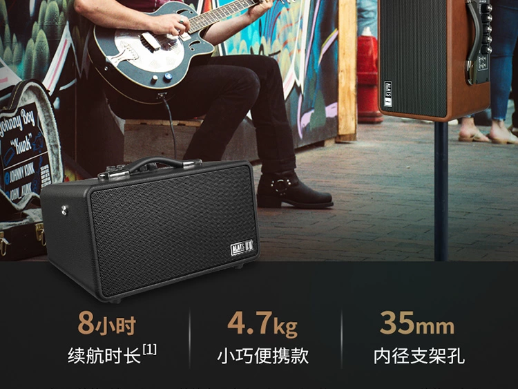 ALATS演艺者M5内置17600毫安时动力锂电池,同时支持室内户外使用!手提式舒适便携设计,边走边听边唱都不累。自带35mm内径支架孔,随时支棱起一场音乐盛宴。