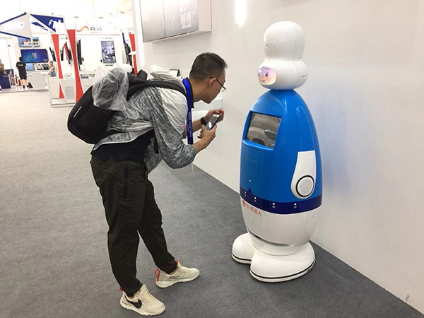 大会主场馆的“接待秘书”是来自猎户星空、达闼、新松等公司的服务机器人,“他们”个个身怀绝技、业务娴熟,用语音交互、手势交互、屏幕显示等方式,来做问询答复、场馆导览,行进中还能自行躲避障碍。