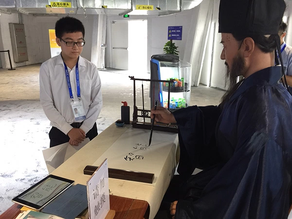 为了验证“王阳明”的书法功力,记者特地在ipad上手写了“智能”二字,然后发送信息。此时,王阳明机器人不急不慢地先恭维一句:“客人墨宝,刚柔相济,别具一格,容老夫献丑,临摹一番。”话音刚落,只见机器人开始转腕、提笔、落笔,转眼间,“智能”二字就在宣纸上写成了,细细地看竟与记者的字迹惊人一致。