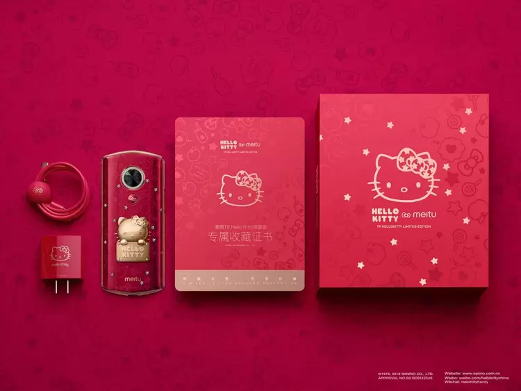 美图T9 Hello Kitty限量版机身以玫红为主,金色的HelloKitty形象和星星加上丰富的背景暗纹设计,形成最具质感的外观造型,引领风格百变的萌酷潮流。而解锁时屏幕会跟随指尖呈现的繁星洒落动效,镶嵌灵透水钻的手机保护壳,更是全方位打造闪亮小心机。