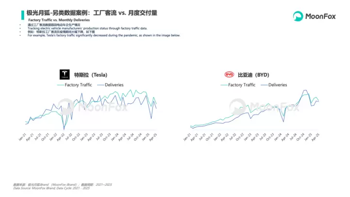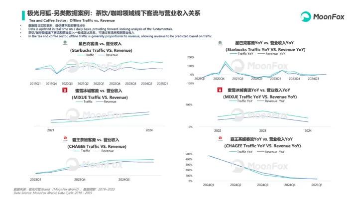 MoonFox iBrand通过线下客流、工厂流量等另类数据,为消费、零售、制造等行业提供前瞻性分析。例如,iBrand可实现茶饮、咖啡等门店的日级客流监测,帮助企业预测营业收入;在消费品牌全渠道分析中,iBrand结合iApp数据,揭示了线下客流与营业收入、线上日活跃用户(DAU)与线上销售额之间的强关联性;针对制造业,iBrand可实时追踪工厂客流动态,为投资者评估企业产能变化及行业景气度提供数据支撑。