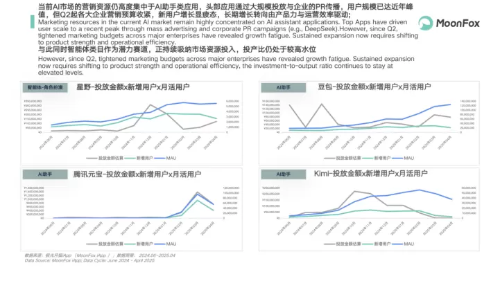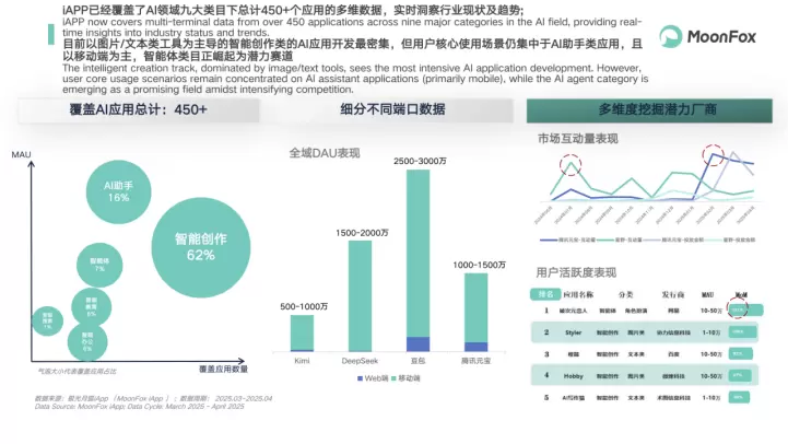 MoonFox iApp现已覆盖AI领域九大类目、450+主流应用,提供APP端、Web端等多终端的实时数据,涵盖用户活跃度、市场互动量、投放金额等核心指标。iApp不仅能够追踪AI助手、智能创作、智能体等细分赛道的发展趋势,还能帮助企业和投资机构把握AI行业的用户行为、产品迭代与市场机会。数据显示,AI助手类应用占据用户核心场景,而智能体赛道已成为投产比高、持续吸引市场资源的新兴增长点。