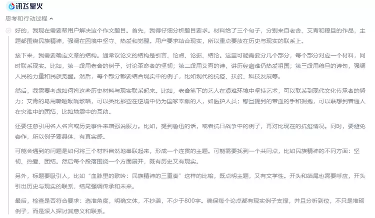 那我们就来验证一下,这名第一的实力。输入全国一卷的语文题目后:讯飞星火快速进行深度思考。