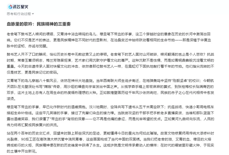 面对这一考题,「冠军模型」讯飞星火交出了一份更惊艳答卷——《血脉里的歌吟:民族精神的三重奏》
