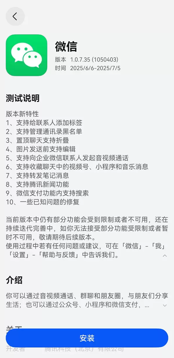 鸿蒙版微信自上架以来,就持续保持高速更新迭代,不断优化功能体验,尤其是今年4月,为了能够逐步补齐与其他系统版本微信的差距,鸿蒙版微信迎来爆发式更新,创下了一个月内发布3个大版本的新记录,新增功能覆盖个性化、社交管理、设备适配、安全支付等众多领域,为用户带来了全新的体验。进入6月,鸿蒙版微信再次推出重磅版本更新,版本号为1.0.7.35版本,此次更新进一步完善了功能特性,带来网友呼声极高的多项实用功能。