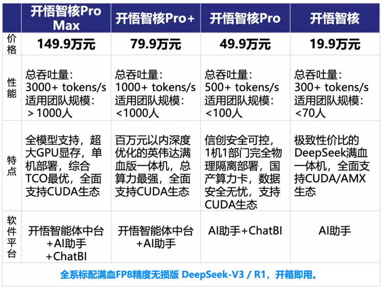 开普云深入洞察不同规模企业多样化的使用场景,推出多版本“开悟智核”产品矩阵,包括:综合总拥有成本(TCO)达到最优的“开悟智核 Pro Max”,具备最强总算力的“开悟智核 Pro+”,实现信创安全可控的“开悟智核 Pro”,以及拥有极致性价比的满血版“开悟智核”,全系标配满血FP8精度无损版 DeepSeek-V3 / R1,产品定价从19.9万~149.9万不等,以极致性价比满足用户的个性化需求。