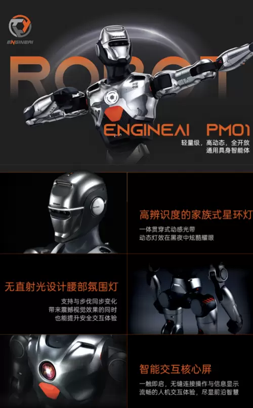 外观方面,众擎PM01京东Joy Inside机器人在头部采用了高辨识度的家族式星环灯,动态灯效在黑夜中更加炫酷耀眼。腰部和腿部交接处设置了无直射光设计腰部氛围灯,支持与步伐同步变化,带来精彩视觉效果的同时也能提升安全体验。胸前搭载了智能交互核心屏,一触即启,无缝连接操作与信息显示,带来流畅的人机交互。