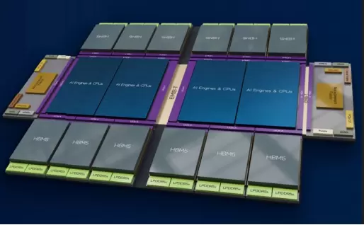 英特尔的EMIB(嵌入式多芯片互连桥接)技术已经投入生产,突破了光罩尺寸的限制,实现了多芯片之间的高速互联。此外,通过硅通孔(TSV)技术,EMIB-T 优化了供电效率,并为集成高速HBM4,以及基于UCIe标准的芯粒提供了简便的解决方案。