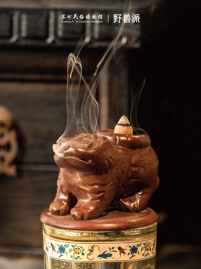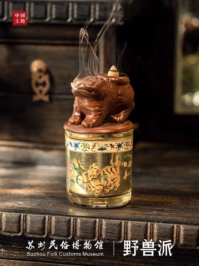 香氛蜡烛瓶身上的猛虎位居其中,环绕菖蒲、粽叶,寓意震慑邪崇。工艺过程中受温度应力等因素影响产生金色纹理,这种自然纹理更别有一番独特美感。香氛蜡烛上,由野兽派独家设计乌檀木材质的“猛虎坐镇”饰件,既是香氛盖,也是塔香香座,一香多用,赏心悦目。随礼盒一同配置的倒流香在点燃时,袅袅仙烟自猛虎口中娓娓吐出,趣意满满。