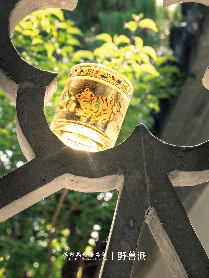 点燃一缕青艾之香驱夏炎,“只此青艾”金箔香氛蜡烛与倒流香多宝盒烛杯瓶身设计灵感来源于苏州民俗博物馆所藏的一件近代时期儿童五毒肚兜,相较于北方老虎的粗犷风格,苏州的虎纹略显精细繁复些。