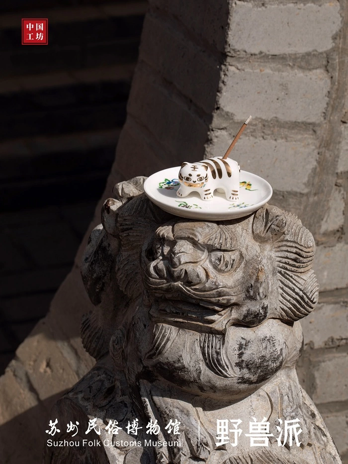 银字笙调,心字香烧,“艾虎纳福”线香盘与五色线香组合,瓷色泽美,滑润如玉,线香盘面纹案灵感来源于苏州民俗博物馆,所藏的一件近代时期名片袋绣品。线香盘面四周的纹案来源绣品的笔、笙、如意等,寓意仕途如意,节节高升。