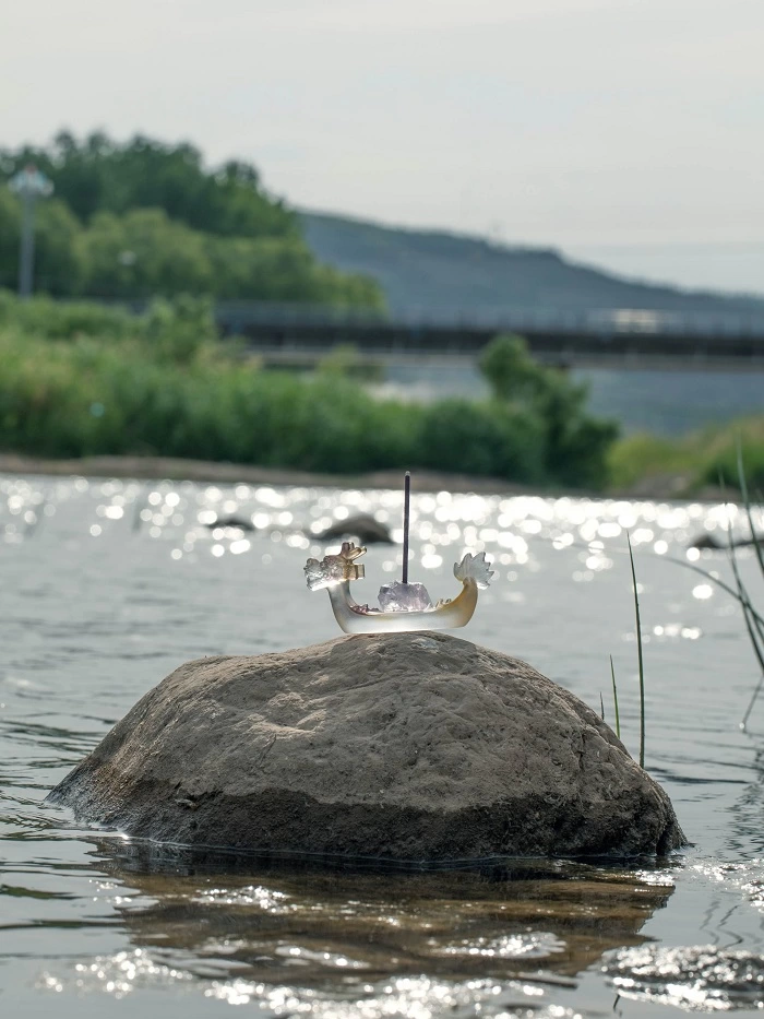 这款琉璃运宝龙船晶石香氛礼盒有中号与大号两款,大号船身身长37cm,中号也有21cm。每艘龙船船身在琉璃烧制时产生的自然晕染的墨痕,也成为一种独一无二的存在。