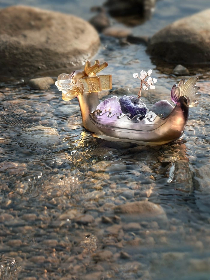 还有玲珑迷你运宝龙船,龙船身长也有约15cm,以紫水晶为香插,配合五彩线香,农历五月,为身心净化磁场,加持能量。